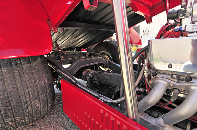 5) There is no driveline. The transmission is coupled to the rear pinion using a drag racing coupler