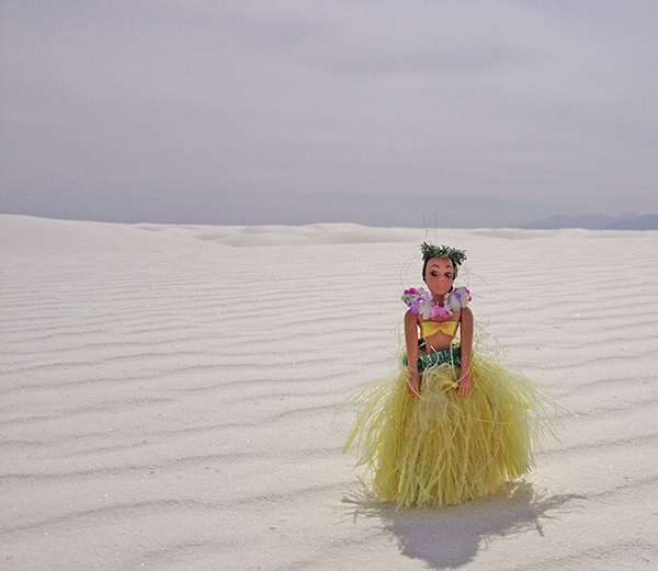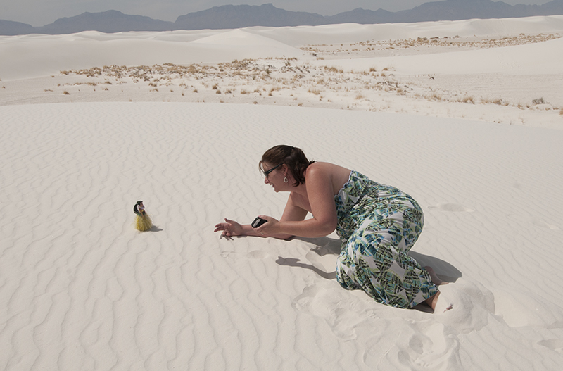 After the museum, we drove to White Sands National Monument. If you go, bring your sunglasses; It is bright as snow. Ann said one or more of the Star Wars snow scenes were filmed there. The sand isn’t sand at all, but crystalized gypsum. Our jeep contrasted nicely against the white background. You can see we had fun taking pictures.