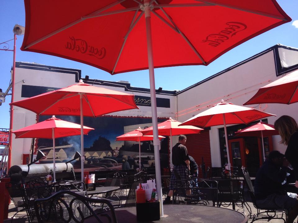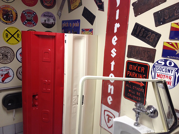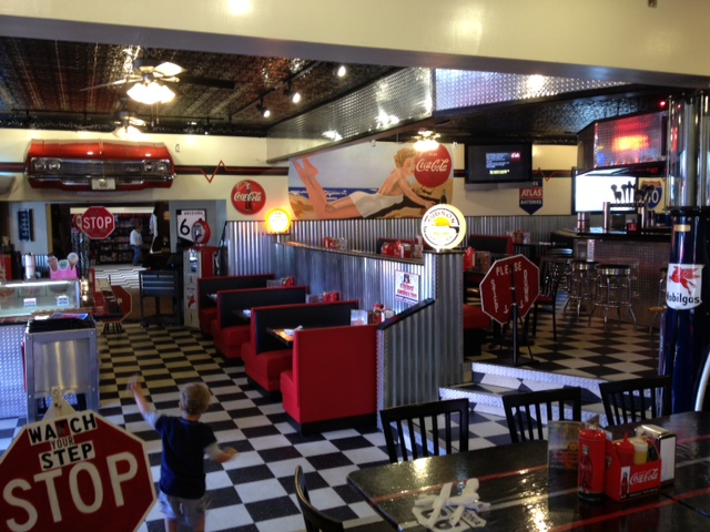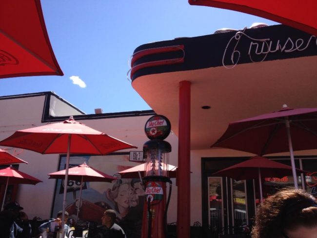 One particular restaurant that caught our eye was called Cruisers Cafe 66. Pulled in by the decor, we discovered their burgers were fabulous as well, with fresh buns and thick meat. Ann’s sweet potato fries were yummy and my onion rings were crisp and flavorful. Here are a few pics I took with my camera.