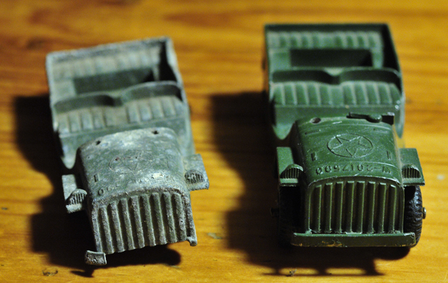 Here is Ann’s first ever jeep (left), given to her by Terry, and Andy’s more complete version of the Tootsietoy jeep: