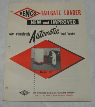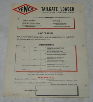 “Venco 1948 (?) Tailgate Loader Model 30 non-color Salesl Folder. Shows Code/Size to match with Studebaker, Willys, Ford, GMC, Dodge, etc. 8 1/2 x 11 inches. Opens 2x cover size.”
