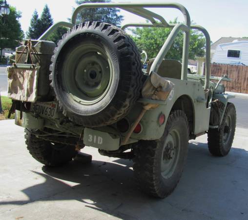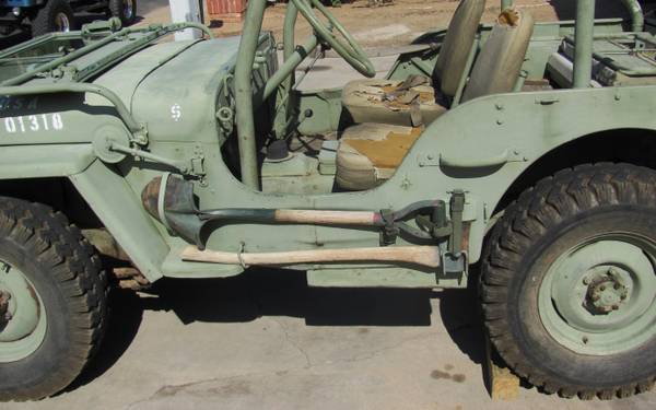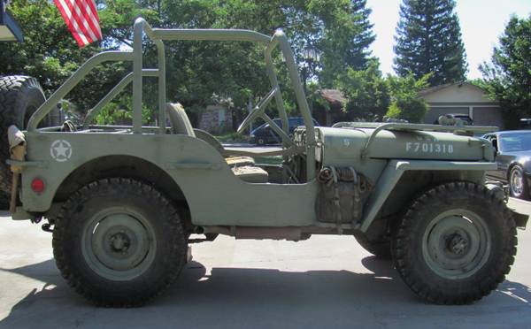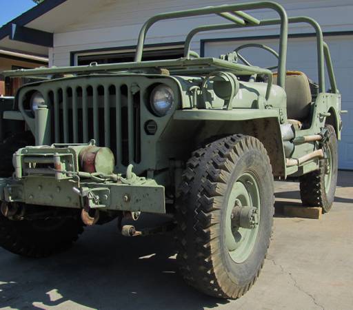 “1944 JEEP – VERY COOL – RUNS GREAT, STORED INSIDE – HAS BEEN ON NON-OP SINCE 2008. HAS FORD STRAIGHT SIX. NEEDS BRAKE WORK. COMES WITH TOW BAR AND HAS SOME EXTRA PARTS – TRANSMISSION, FRONT AND REAR AXLE HOUSINGS . $7000.00 OR BEST OFFER . WILL TRADE FOR WW11 GERMAN PISTOLS LUGERS, P.38 OR LEVER ACTON WINCHESTERS .”