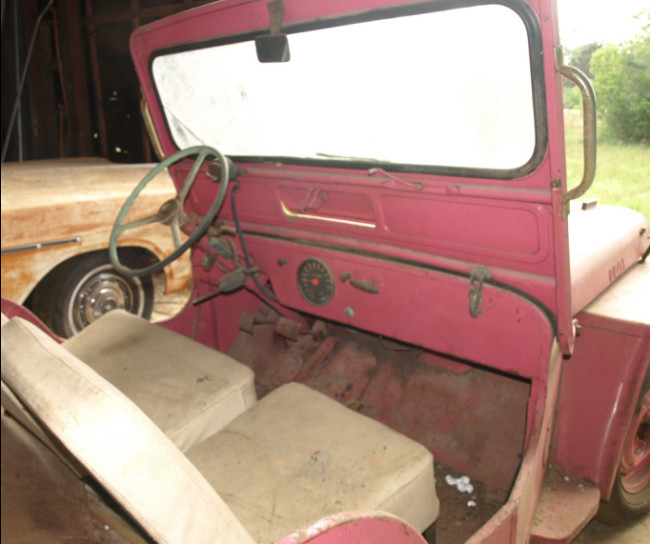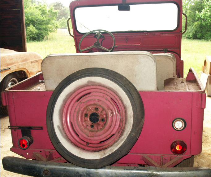Hope I can help to clear up some of the questions, and maybe get some help in the process. I bought the pink jeep from the estate of a gentleman in Henleyfield, MS. Had several conversations, emails an text messages with him to try to confirm as much as possible that this is a real Surrey. Vin tag (which is partially obscured by the add-on horn) shows 56337 18647. The body has absolutely no rust other than minimal surface rust. Even after asking the question four or five times I was amazed when I saw it in the light. The holes in the fender tops for the straps are there as are holes in the windscreen frame. Once I took the pressure washer to it, the dark pink under the front fenders fell away revealing the light pink (coral mist I think…). The bottom of the valance that was just sitting between the grill and the bumper as well as the back side of the bumper were the correct light pink as well. The top frame was all there except for the 4 rods. 3 of the four tires even held air! Motor is stuck, but I’m working on that with Marvel Mystery oil now. Hope to get it unstuck, but may start to dismantle anyway and just tear down the motor and rebuild. The car was purchased by the previous owner in 1967 in New Orleans where the son (who I purchased the car from) used it to drive to high school. The respray of all pink happened before they owned the car. They also never used the top and he doesn’t remember ever having hubcaps on it. But that was a long time ago. It sat in a barn in MS for about 40 years till his dad, the owner, passed away. Barn was full of 60’s cars.