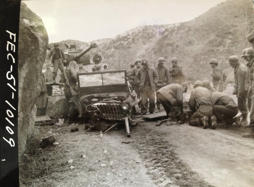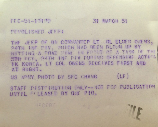 The Jeep of BB Commander LT Col Elmer Owens, 24th line div, which had been blown up by hitting a road mine in front of a tank of the 5th rct, 24th line div during offensive action in Korea. LT Col Owens receives first aid at right.