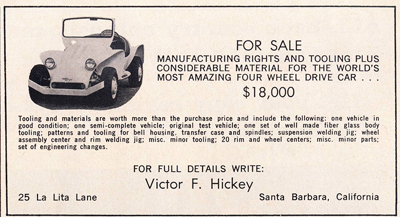 I ran across this unusual ad for the complete setup for an unusual 4×4 in the February 1964 issue of Four Wheeler Magazine. The prototypes and parts were being sold by Vic Hickey (or he was acting as an agent). Anyone have more information on this? It appears to be a four wheel drive dune buggy.