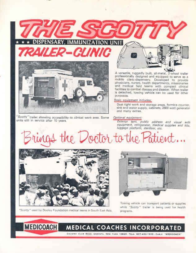 “original non color sales sheet , 8.5 x 11 , shows Scotty Dispensary , Immunization Trailer Clinic as used by the Dooley Foundation in Southeast Asia. Produced by Medicoach , Oneonta , New York.”