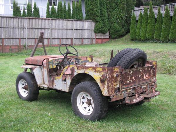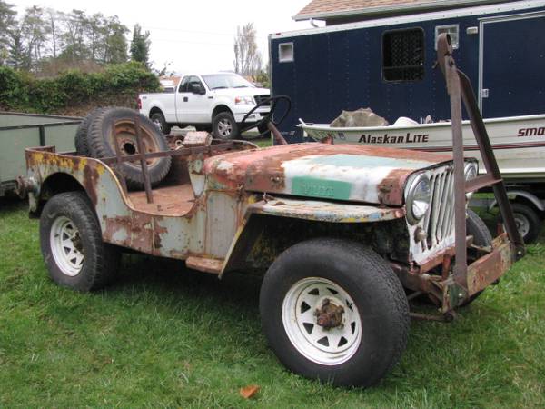 “1947 Willys Jeep CJ2A. We don’t know much about it. We were told it runs but the starter is weak. It’s just more of a project than we are ready for. Clear title. As is. The tow bar works good and fit’s a 2″ ball.”