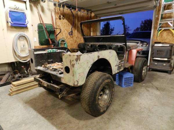“1972 CJ5 Jeep, frame, drive-train, V8 engine. Project jeep the body is of a 1953 M38 with many of the parts modified. Many parts both of the 53 era and of the 72 era. Fun project but have to move. Body mounted on the 72 frame no modifications required bolted in”