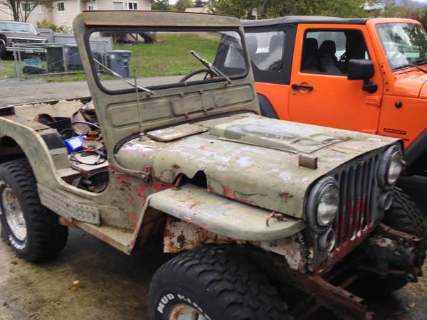 “1949 Willys CJ-3a Jeep for sale. This is a project. No engine, transmission, transfer case. or hood. Has fenders, grill, and windshield. Needs lots of work or part out. Tub is rusty but I’ve seen much worse get fixed. Have title and matching vin tag. Might be a good rockcrawler project, Jeep rat rod, fix up and putt around, or?”