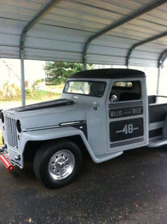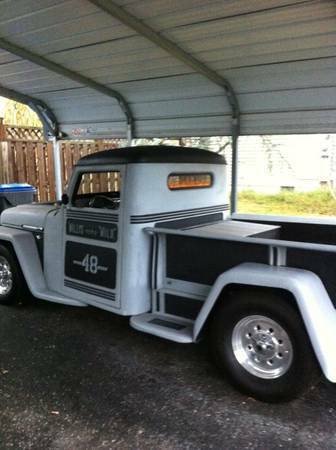 “1948 Willys Pickup. Very very rare! 2WD. Only about 1,100 were made. It had less than 38,000 miles when it was turned into a hot rod truck. HP302ci built up with around 10,000 miles. Chop top, suicide doors, mustang 2 front end. Too many features to list. $8,000 cash, as low as I’ll go or will trade for a cool old car from the 50s-70s. You couldn’t build this truck for twice that amount.”