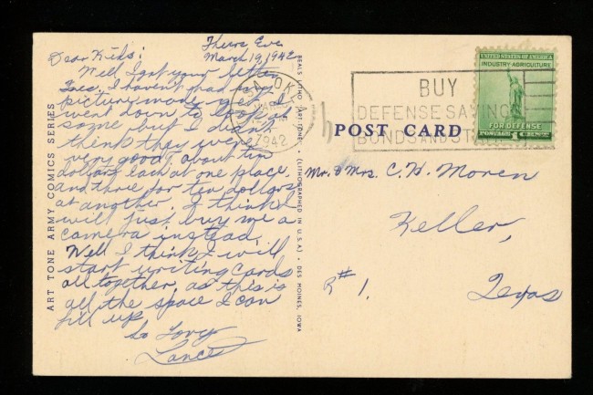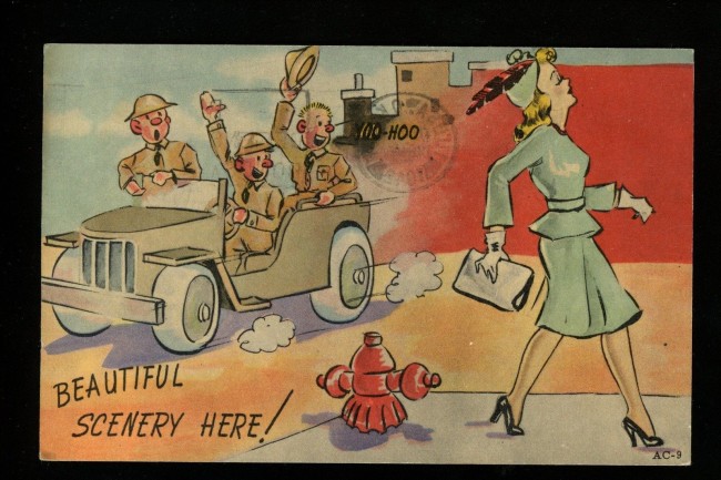 “Military Comic Postcard WWII linen sexy lady army soldier jeep Art Tone AC-9 cancel 3/26/1942 Tulsa OK”