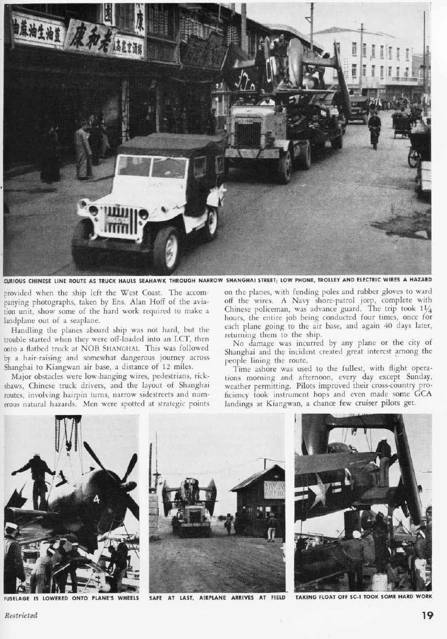 This late 1940s(?) photo shows a Navy Shore-Patrol jeep leading a truck carrying a Seahawk through the streets of china. These planes are being shipped from Shanghai to Kiangwan Air Base.