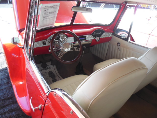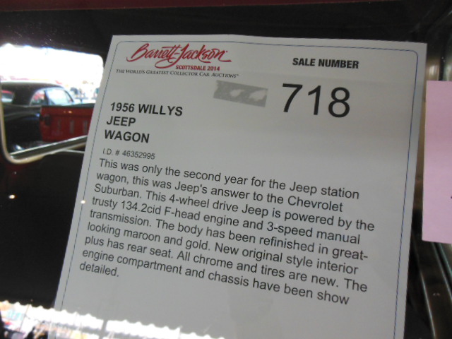 A very nice Willys wagon, 4WD,  upon closer inspection, it is advertised as a 1956, however carries a serial number 463 52995 which designates a 1948 2WD wagon.  The body itself appeared to be that of a 1952-53 model, small speedo with the gauges underneath, squared off rear wheel openings and taillights in the rear corners.  Nothing on it appeared to be a 1956 at all.  The seller wrote the copy for the windshield sticker and thinks this was the second year for the Willys station wagon.  Obviously Barrett-Jackson doesn’t check the validity of some of their sale information!!