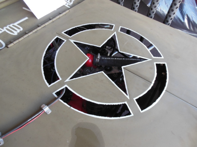 A customized 49 CJ3A complete with rear tractor seat for the machine gunner, extended front suspension and steering for a smooth ride and a fake driveshaft for the front axle. It did have the L-head 4 banger under the star on the hood. Had the ignition coil mounted on the outside of the hood.  See wires snaking through the star!   WWII Hand grenade for a hood ornament.  Actually kinda neat!