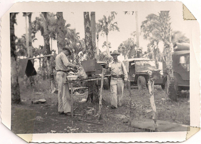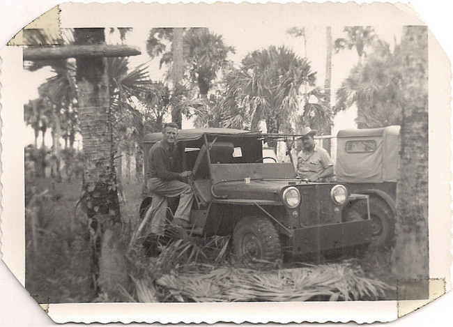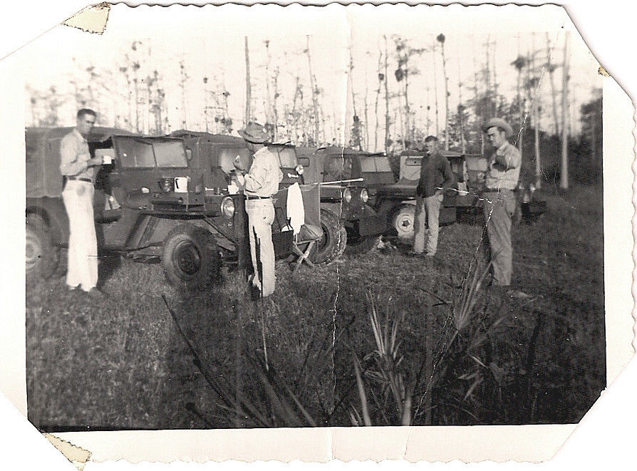 Third pic shows jeep with dual rear wheels and fender flares. I think maybe the front fenders hve been widened and support rods added to push-bumber. Full tops must be for daily Fla. rain or bugs. I wonder if this guys are hunting, or surveying for new highway. Very interesting historic photos.