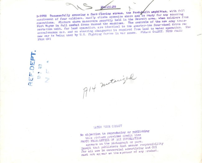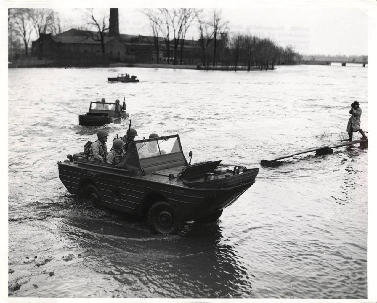 “1943- Soldiers from Fort Wayne give Ford amphibian reconnaissance cars a workout on river in Detroit.”
