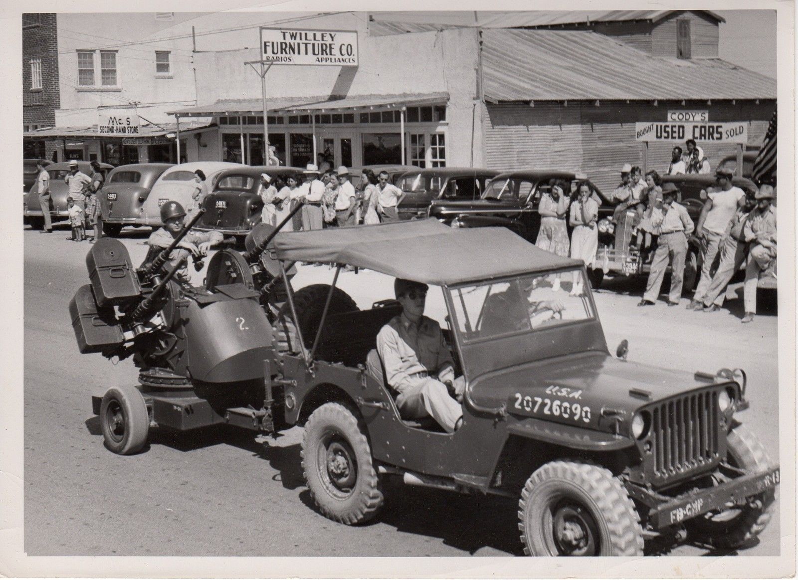 “This is an original 5×7 black and white photo. Showing an Army Jeep pulling an anti-aircraft gun behind it in a parade. My guess would be late 1940’s by the looks of the cars in the back ground. Great Vintage photo to look at!