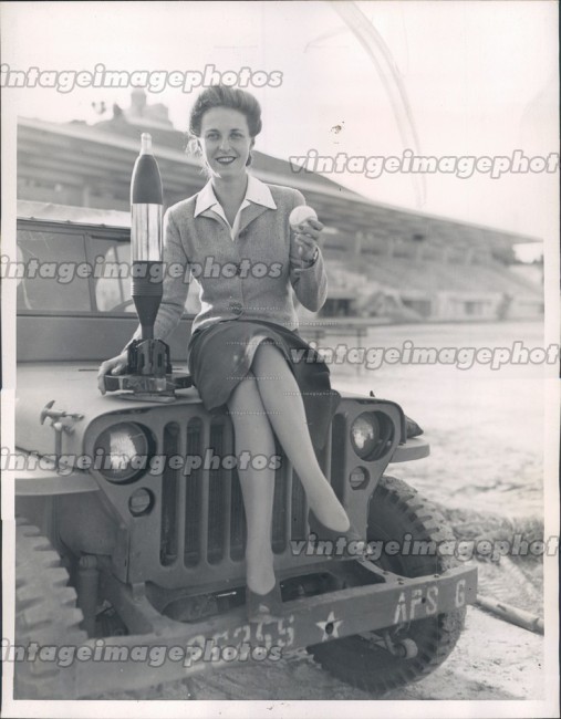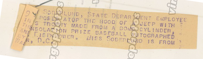 Isn’t this an unusual photo? Based on the folded caption on the back of the photo, Dorothy Soderlund was a State Department Employee who is holding a trophy made from a bomb casing and a baseball signed by Eisenhower (possibly Dwight).