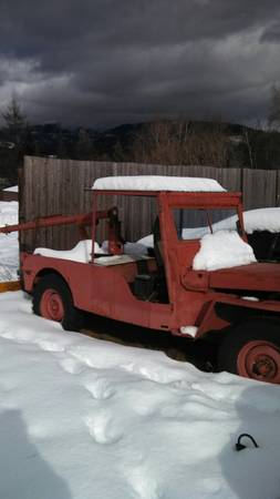 “I think its a 1944 willys jeep has the original flathead 4 cylinder four wheel drive works. was used to plow the driveway has a back blade. Hasn’t been ran since last winter should run, the frame has been broke by the front leaf springs.”