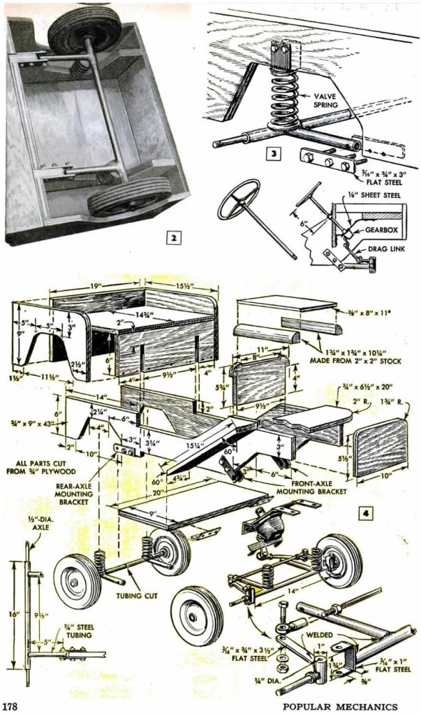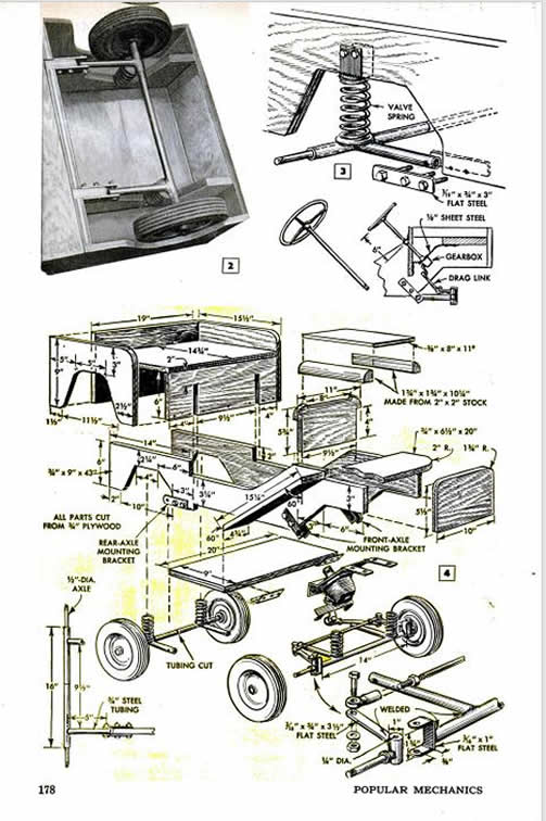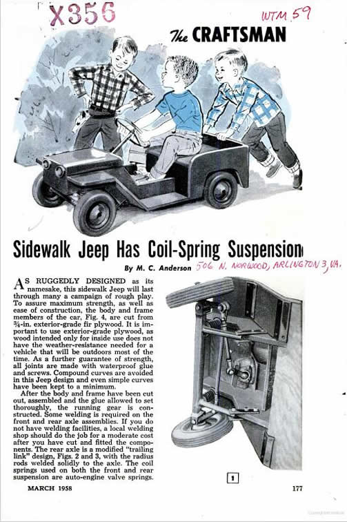 Plans for this sidewalk jeep were posted on eBay for sale. Originally published in the March 1948 issue of POPULAR MECHANICS, the plans are also available for free at Google Books.