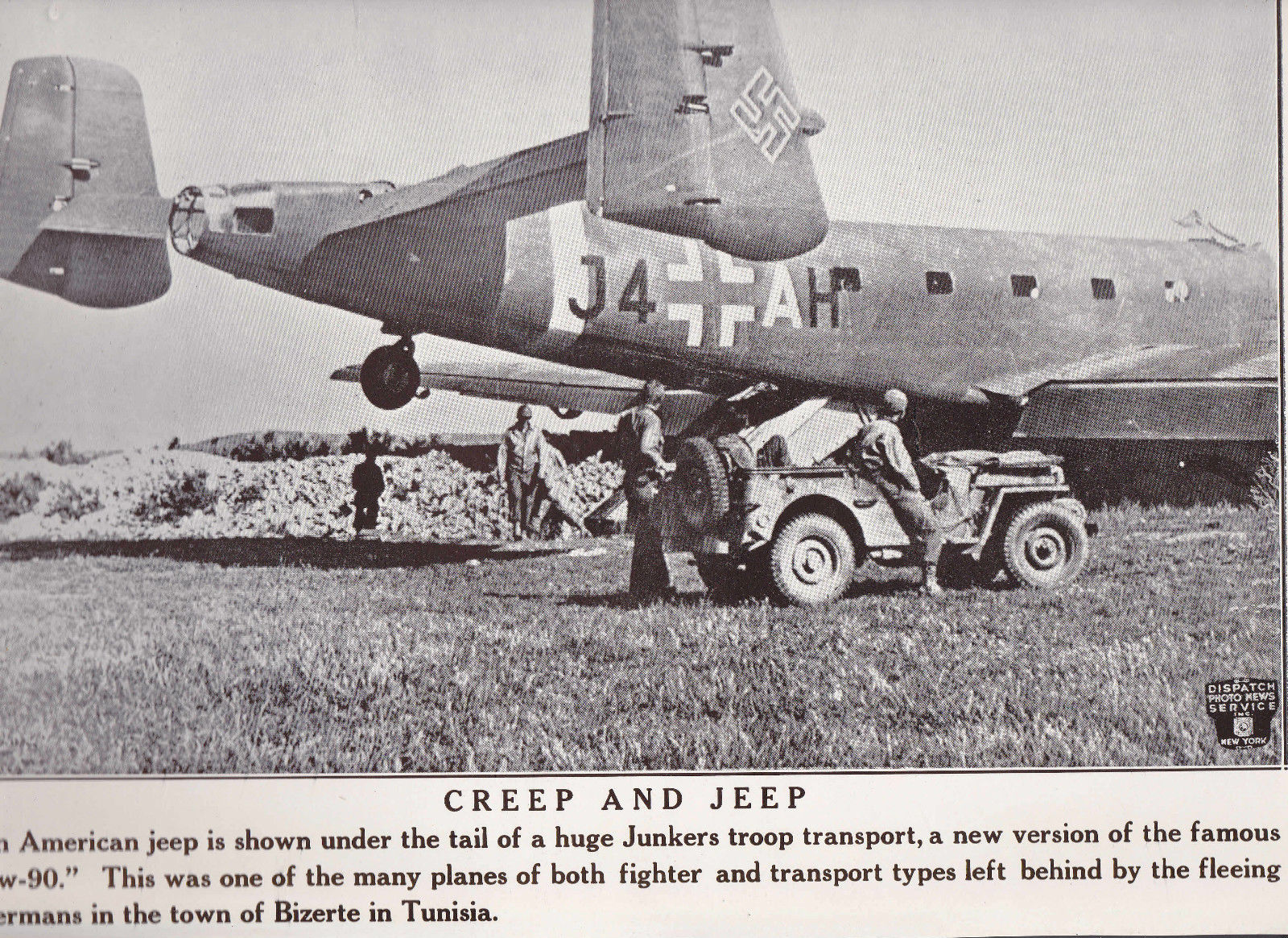 “American Jeep Under Tail of Junkers Transport WWII Dispatch Photo News Service
