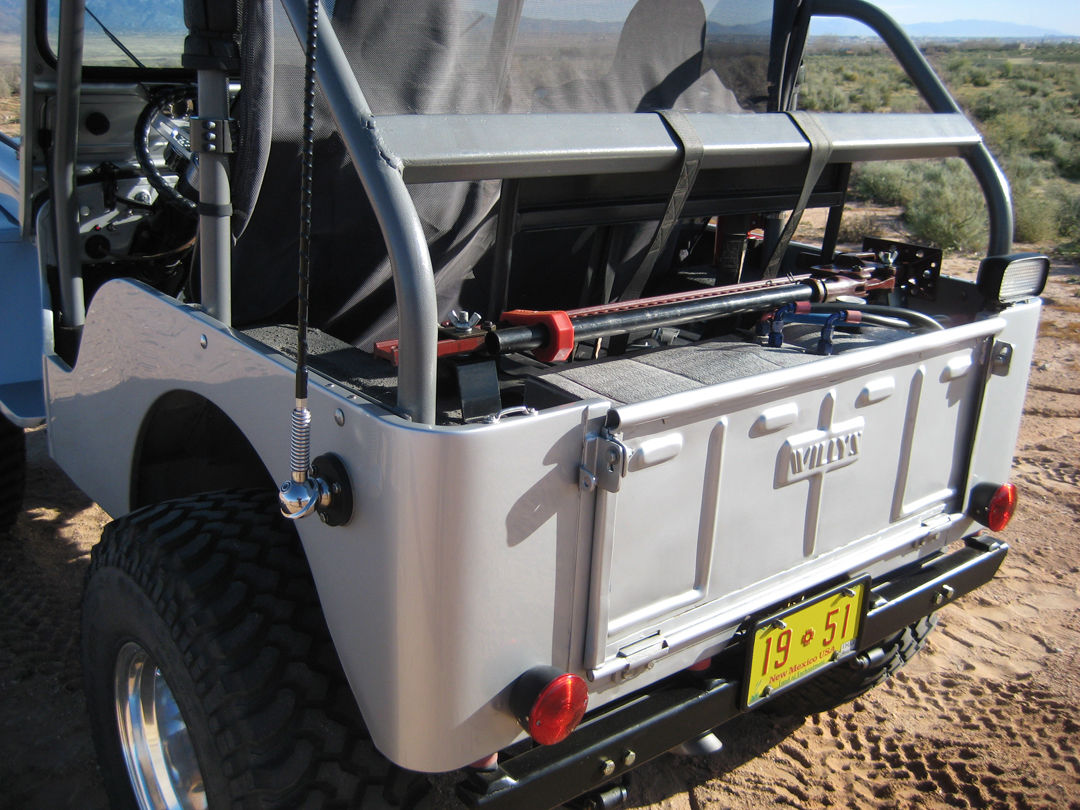 15 gal stainless Summit Racing fuel cell, custom rear bumper, Warn 8000 winch and winch kit, High Lift jack mounted in rear, powder coated roll cage, Optima battery, fire extinguisher.