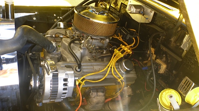 ” 350 Chevy eng, 350 A/T, P/S, P/B, Disc brakes front, 28? gal aluminum gas tank, needs new top. Chrome is so so. needs redone.”