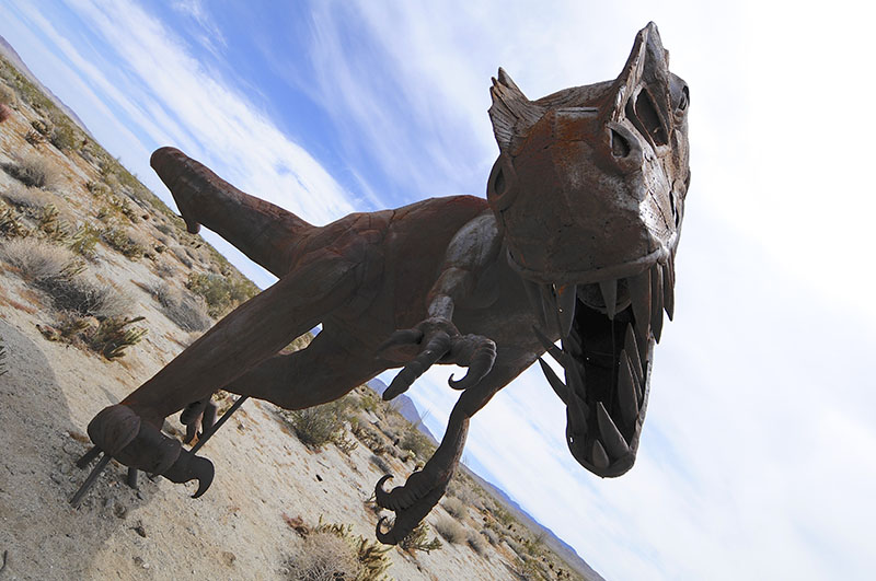 An amateur paleontologist and wealthy philanthropist named Dennis Avery learned of Ricardo’s work and commissioned him to make more, to create examples of the dinosaurs and animals that used to roam the Borrego Springs area. Completing those commisions led to more works. Currently, Borrego is home to 131 sculptures, some small, some big and some unexpected.