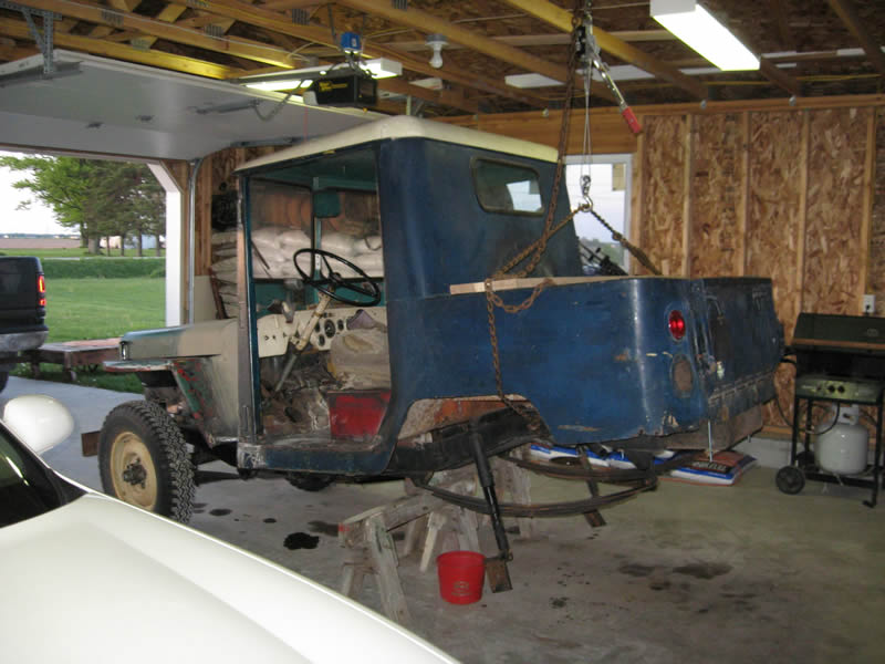Well needless to say we bought 2 parts jeeps to put this one back together. So we made the front look like a cj2a.—pictures 13-17—. We kept the original f 134 in it by raising the body 2 inches with square stock steel. Picture 14 shows we had an axle go bad so we had to switch it out.