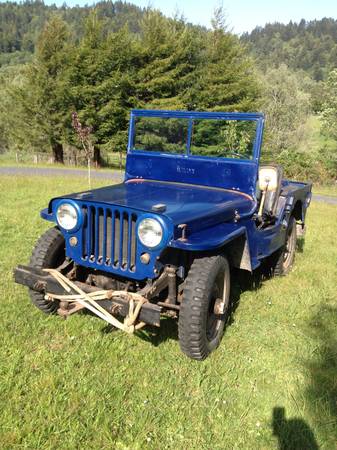 “Here it is! An unmolested flat fender Jeep. Runs like a swiss watch- flat head four cylinder. Hood, fenders, windshield, tailgate and vertical body panels are GOOD. Floor pan could use some patching in places. No top- who needs it? I only drive it on the weekends in good weather. I have a ton of spare parts including an extra transmission. Front brakes were upgraded to 11″ drums a couple years ago and this dude will now actually STOP when you want. Military style tires. Have a tow bar for it, an old (very cool) service manual that actually tells you how to fix stuff. Oh and it has a PTO that kinda works but I have nothing to run off it. If you’ve been looking for an original reliable old flatty this is it. No lift kit, no V-8 stuffed in it. Pretty much the way it was built (except upgraded to 12V and the brakes). Won’t last long. I’m not really dying to sell it so no low ball offers. No 215 or other crap- you’ll need cash for this. I will be able to show this to people on the weekend, 4/26-27. If you’re interested shoot me an e-mail. No- the dog doesn’t go with it….”