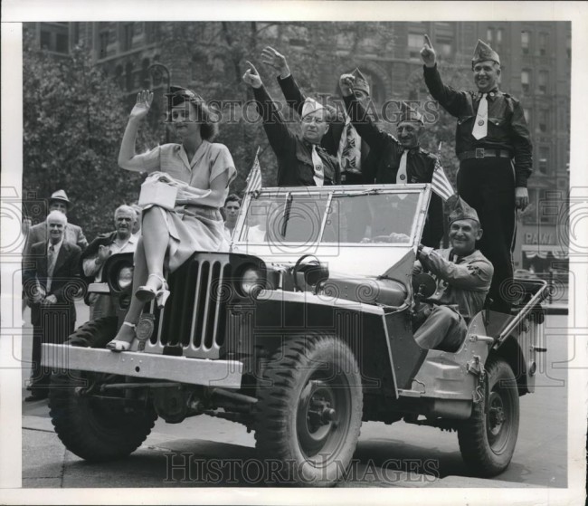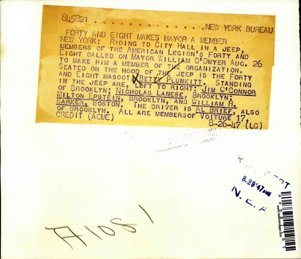 “1947 Press Photo Members Of Amer Legion’s Forty & Eight In Jeep At NY City Hall”