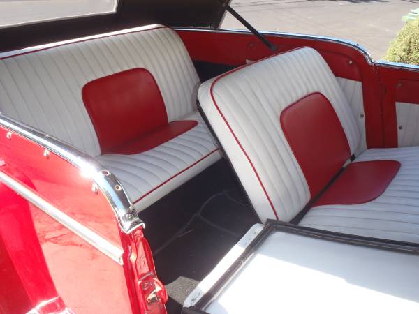 Restoration was done prior to 2006. All the chrome was done and shows nicely. At that time all was pretty well sorted out there were a few minor details that were not completed in the restoration which I was going to complete for the owner but due to personal circumstances I had to close up shop and was unable to complete these minor details. For the last couple years or so the Jeepster has be in storage. I have manuals and some odds and ends parts a spare tire cover that matches interior in red and white. Engine runs very nice. I last drove it around town about a year ago and it drove well, straight and brakes were good. Well I pulled it out of storage and took the Jeepster for a drive. As any older car thats not been used for a wile I started loosing brake pedal so the seals/cylinders well need to be checked. Check ALL the pictures they tell the story. Pretty much rust free undercarrige and pans. The only place I saw of concern is at where the back bumper area meets the body there is some small surface bubbles. see pics.