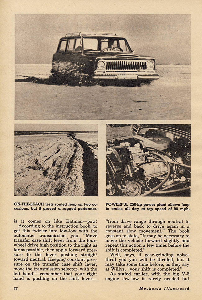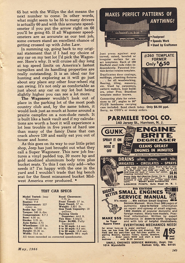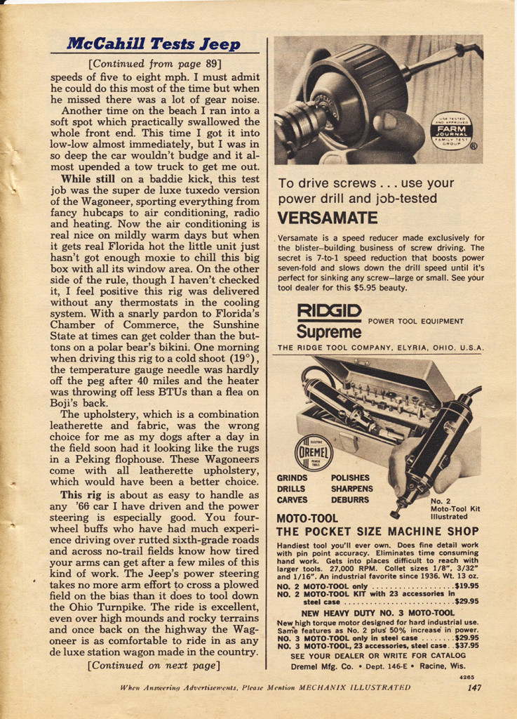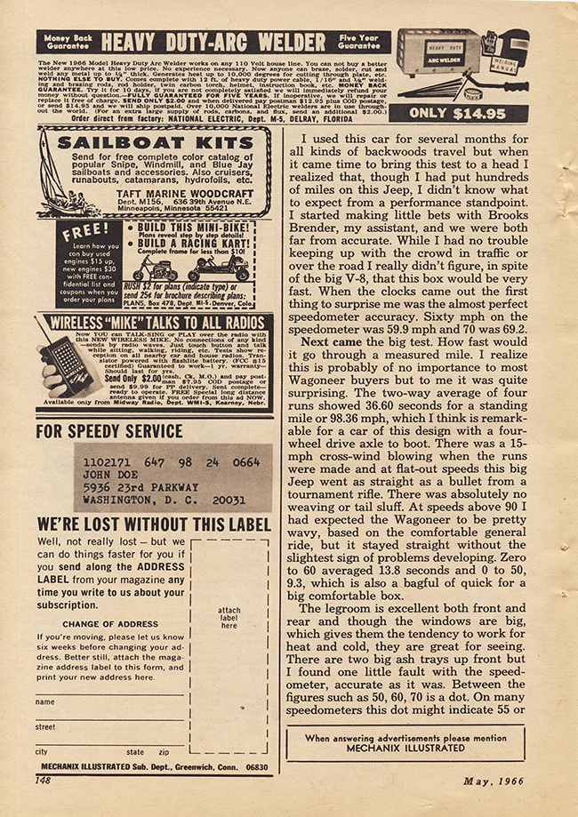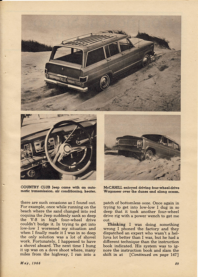 In a comment from the post about the FC-150 review by Tom McCahill, Mike remembered seeing McCahill’s review about the Jeep Wagoneer. It didn’t take me long to find a cheap copy of the May 1966 issue (pg 87) that featured the surprisingly enthusiastic review of the Jeep.