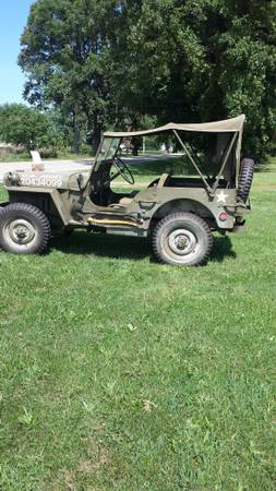 “1945 Willys MB Jeep. This is the type of Jeep used in World War II. It has a new reproduction steel body and Frame, rebuilt engine, transmission, and rear axle. It has new reproduction tires. It needs the lights hooked up and general detail work. We have well over $10,000 invested in it.
