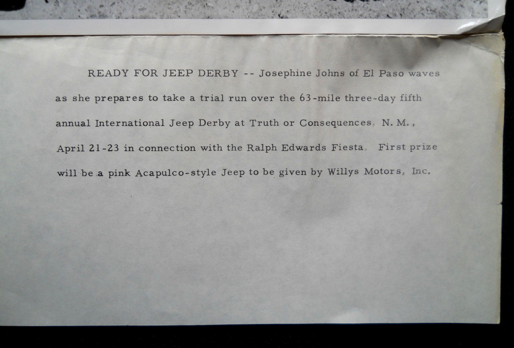 I found a good resource for some Jeep Derby race info. In 1961, “Critt Coburn of Las Cruces, New Mexico, received a pink Jeep for winning the fifth international jeep derby. Second place went to Art Sullivan and third place winner was Richard Beyer of Messilla, New Mexico.”