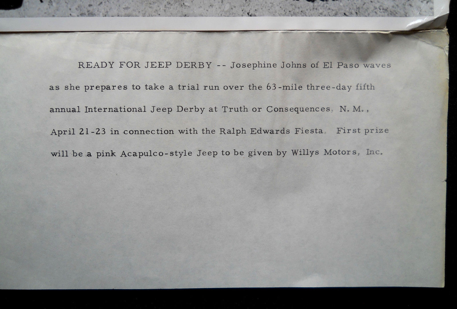 “Here is an Original Vintage 1961 5th ANNUAL JEEP DERBY Josephine Johns
