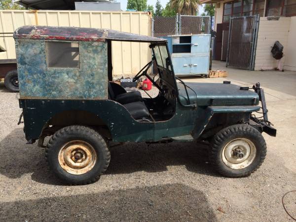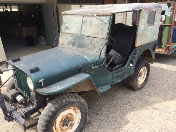 “1946 Willy’s Jeep. Come with hardtop. Engine runs. Need tire’s and brake work. Has not been registered since the late 90’s, (use on private land). Have the pink slip. All original but over size 14 inch brake drums on all 4 wheels. Have lots of extra part that I might be willing to through in for the right deal.”