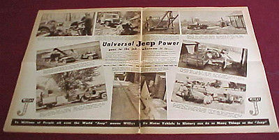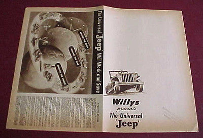 “Here is an Original 1945 1946 Jeep CJ-2A Mailer Type Brochure. Size is 10.75″ x 14″ folded and opens to a nice large 21.5″ x 14″ to show the views in the listing. Condition is N.O.S. (new old stock). This may have been the first sales literature for the new postwar Jeep. Printed on Newsprint they show some aging as the pictures show.”
