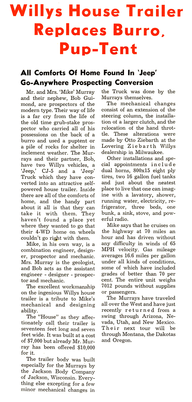 The April 1956 Willys News contains the story below about a Willys Truck that was transformed, using a purpose-built body, into a motor home.