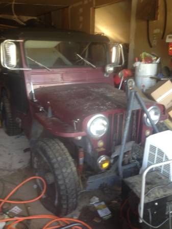 “1951 Jeep Willy’s with winch, and tow bar 3A, 4×4, needs some minor work (like carb redone, soft top, fuel pump, tires re-beaded otherwise great tread ) We have parts, (used fuel pump with glass bulb intact, carb kit, plugs, sparks, cap and rotor), 3speed with over drive, ran when we pulled into garage….. Clean Title. very very little rust – been in garage Asking $2995. ”