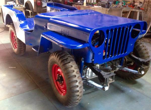 “Professonally rebuilt from the ground up. 1948 Willys Jeep. Motor, transmission, transfer case and both axles completely rebuilt. New brakes, new clutch, new brake lines, new exhaust, rebuild starter, rebuild carb, new water pump, new fuel pump , new shockes, new alternator, new clutch, new steering system, and New American made firestone Military tires on freshly bead lasted and powder coated old stock rims. Newly bead blasted body parts primed and painted stock blue color. Tub and tailgate are new from Omix built to OEM specs and I must say they are. Went with 3a tub instead of 2a in order to upgrade and gain extra 2″ of seat room between steering wheel and seat back. All new wires, gauges, cables and controls. Old stock seat frames refinished and recovered. All new rubber and all new glass.”