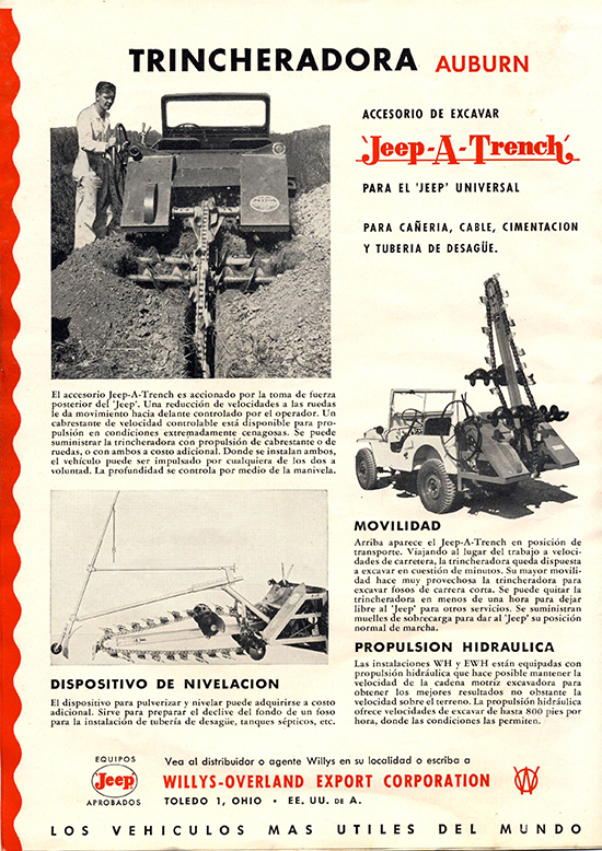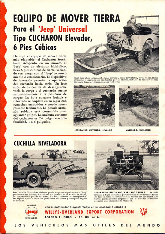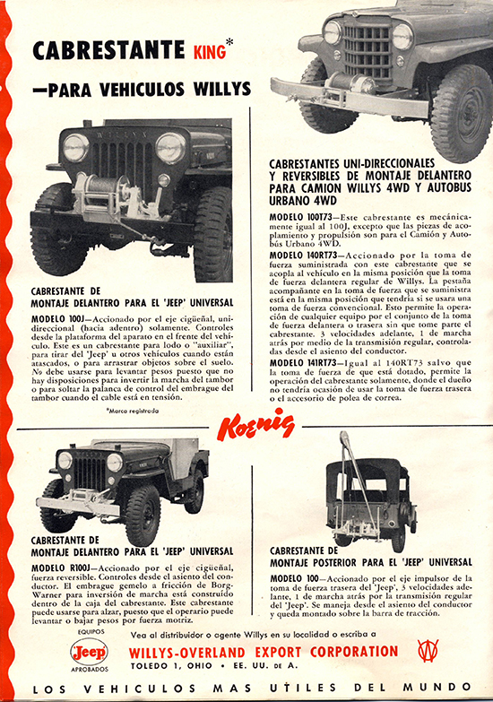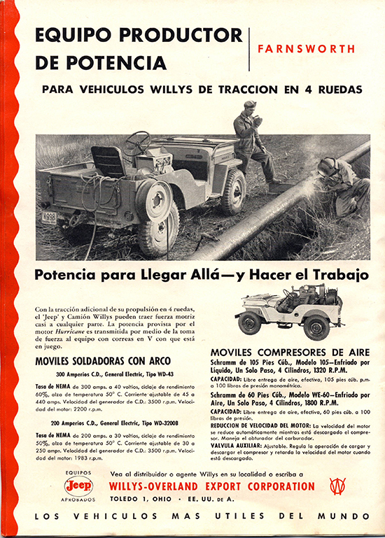 This 1954/1955 brochure is the Spanish translation of a brochure titled in English: “The World’s Most Useful Vehicles and their Special Equipment”. It also seems to be known as “Jeep Specialized Vehicles and Equipment”: