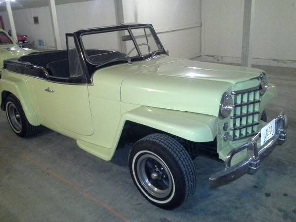 “1950 Willies Jeepster parked at Nampas 1 2 sellit park & sell lot in Nampa 2919 garrety blvd & Kings corner . Stop in and check it out.”