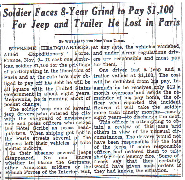 Steve found this unusual article about a soldier that lost his jeep and trailer. As punishment, his pay was docked by the cost of the jeep. Here’s a link to the original article.