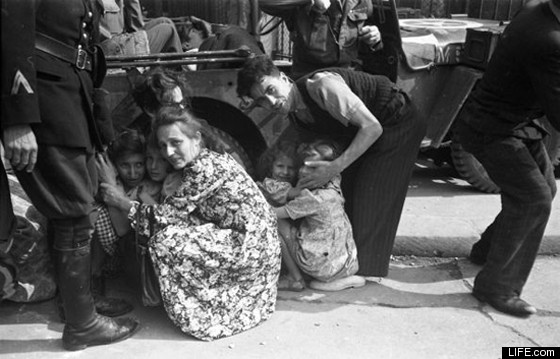 This unpublished Life Magazine photo was published by this site in 2010. During the liberation of Paris, German soldiers remained in the city, occasionally acting as snipers. In this photo, a French family seeks shelter next to a jeep form a sniper.