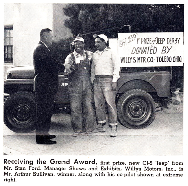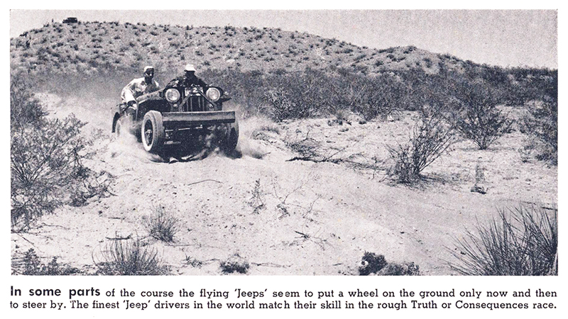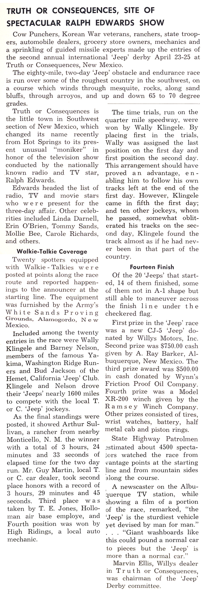 The May 1957 issue of Willys News covered the 2nd Annual Jeep Derby in Truth or Consequences, New Mexico. Among the racers were Bud Jackson from the Hemet Jeep Club and Wally Klingele and Barney Nelson from the Yakima Ridge Runners. Klingele and Nelson drove their jeeps to the event! Only 14 of the 20 entrants completed the eighty mile race.