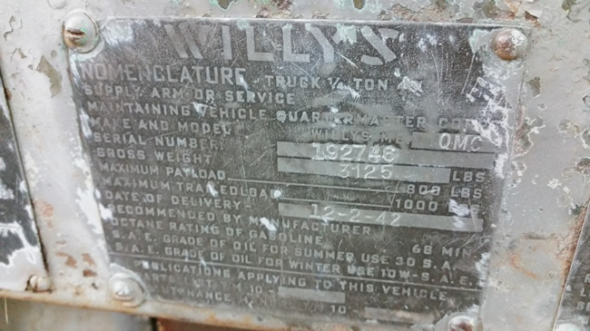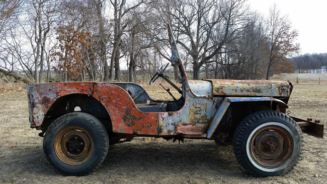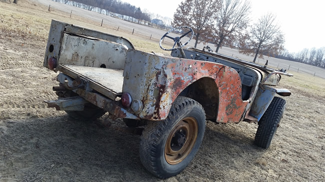 (03/29/2015) “Description: For sale is a 1942 Willys MB, date of delivery 12-2-42. I brought it home and cleaned it up and thought about parading around after restoration, or even driving it the way it is because it looks evil. Then it hit me that I’m leaving for college in the fall and won’t have the time (or money) this Jeep deserves. I’m finishing up a full restoration now. After the beast survived the war, it was sold as surplus to a farmer in southern Indiana. He used it to pull and haul equipment from his lake house to the farm. Unfortunately it was never titled because there was never a reason to, but I will provide the past two bill of sales and make another highly informative one. The body is rough but savable and the floor is very solid. It has a 2A windshield and CJ rims. Mechanically it has a truck engine and T90 tranny; the engine/tranny is free and was told it last ran about 5 years ago. The frame is very solid and matches the body serial numbers. It has the full floating rear end and correct front end. On the hood the original military numbers are peeking out. This veteran is definitely a candidate for restoration or run it the way it is, there’s something special in a non-restored Jeep too. I hate to see it sitting around for years while I get on my feet and would rather see someone else enjoy it.
