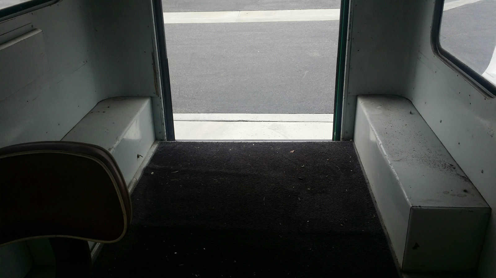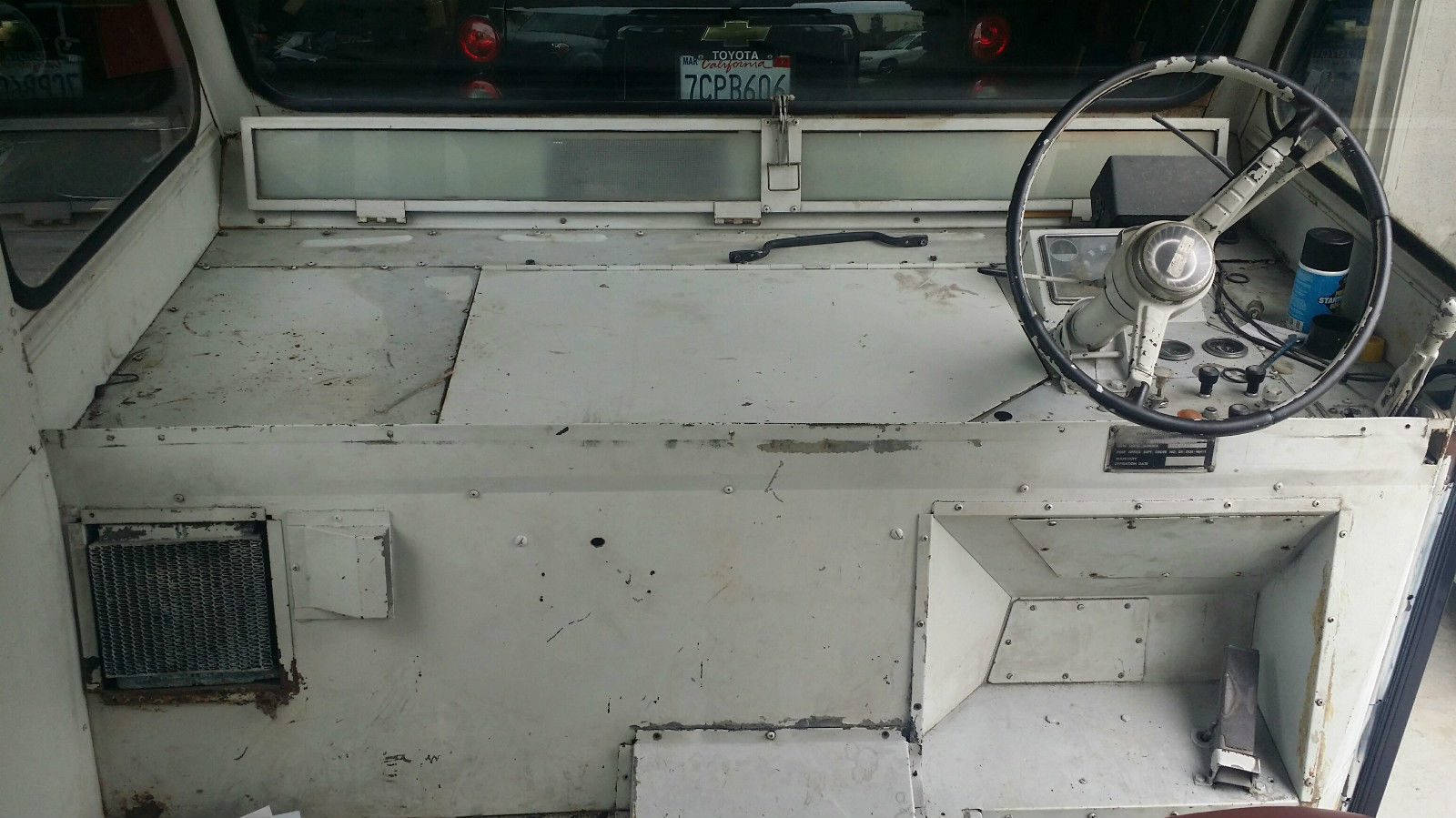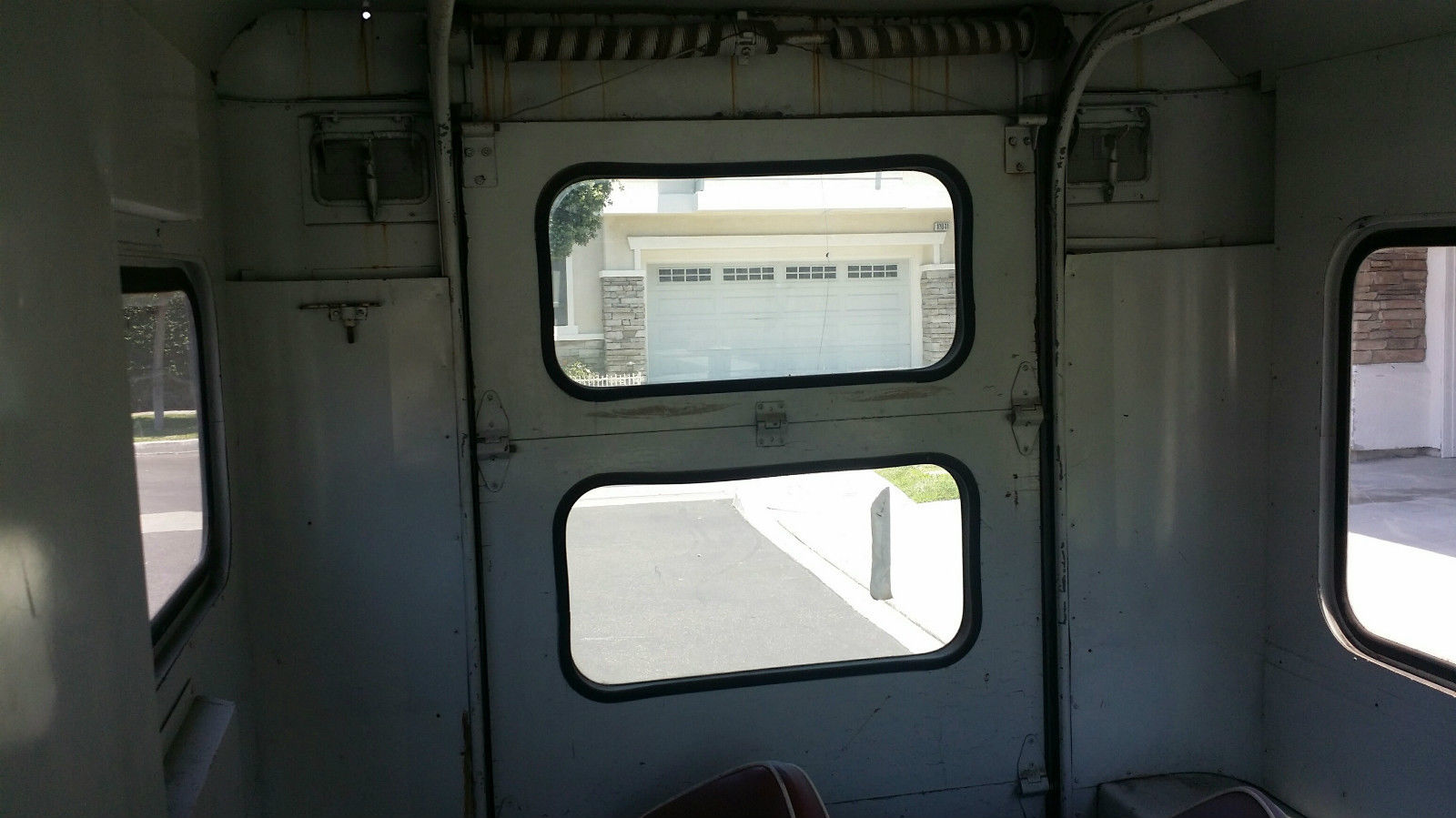 There is a small rust hole (about the size of a quarter) on the floor below the driver’s seat, the rear roll up door needs new springs, there are a couple pieces glass that are cracked, The sliding door could use a little lube as it doesn’t slide properly (but it isn’t a problem to open and close…just a little tight) and the paint on the door is a little scuffed due to the issue with the door. Windshield wipers work but we had them removed when painted and glass installed and have not put them back on.