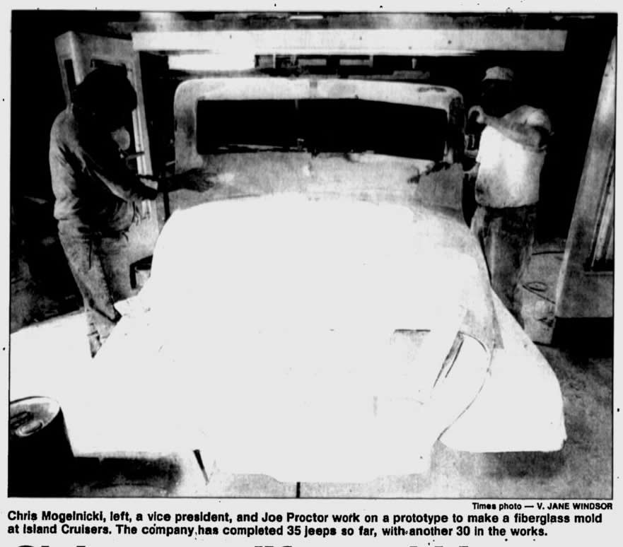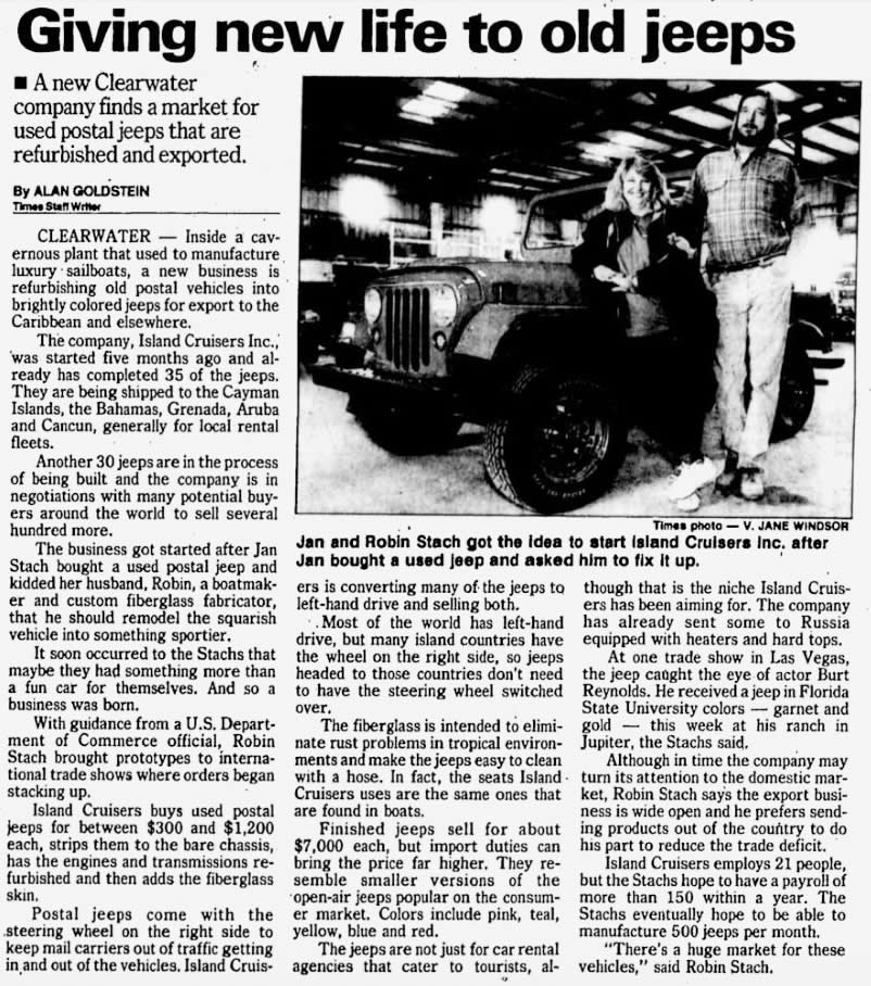 Jan and Robin Stach started the company. By the time this article was written, the company had sold 35 jeeps to the Bahamas, Grenada, Aruba, the Cayman Islands and Cancun. They were generally used for rentals. The company had another 30 jeeps in process. The Stachs feel that demand was huge and they hoped to mature into a company capable of producing 500 jeeps a month.