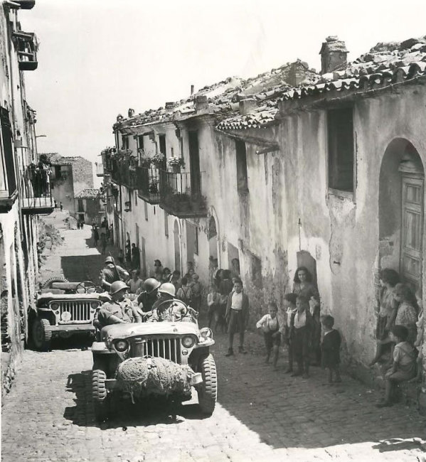 “1943- Natives of Pollina, Sicily, watch American soldiers and their vehicles moving along in a narrow street after the town fell to the Allies. Note surge tank on front jeep.”
